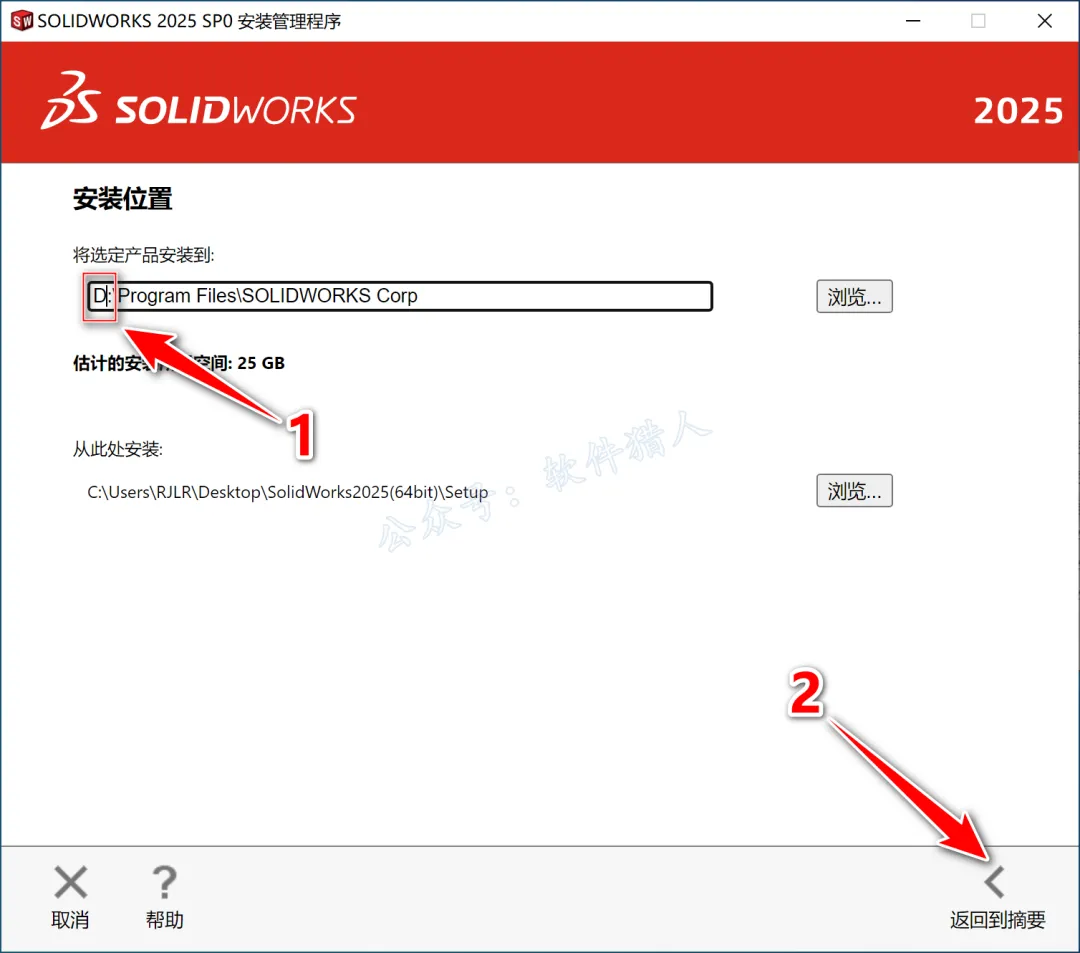 19.修改路径地址中的第一个字符C可更改安装位置(如:把C改为D软件将安装到D盘,记住修改后的磁盘,后面的步骤会用到),点击【返回摘要】。