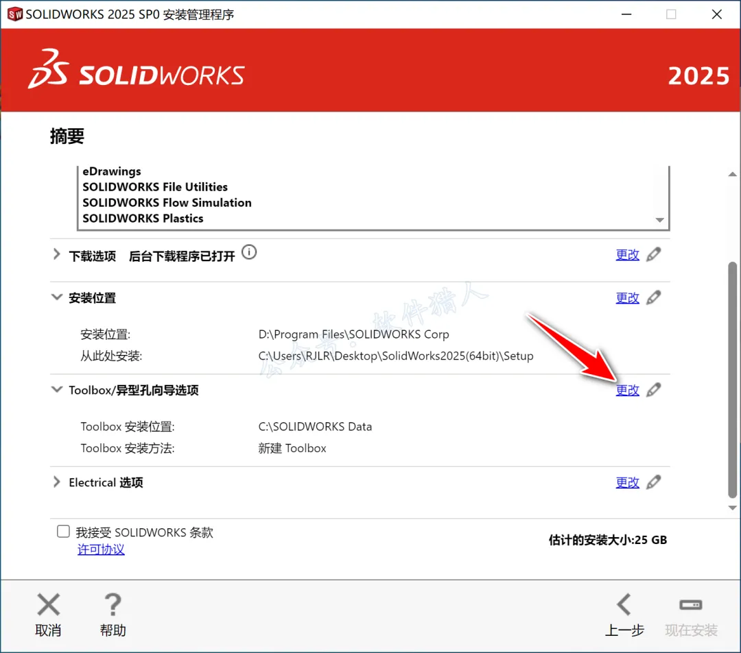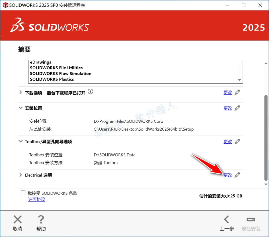 22.点击“Electrical选项”(若勾选了该产品,没有勾选可忽略此步)后方的【更改】。