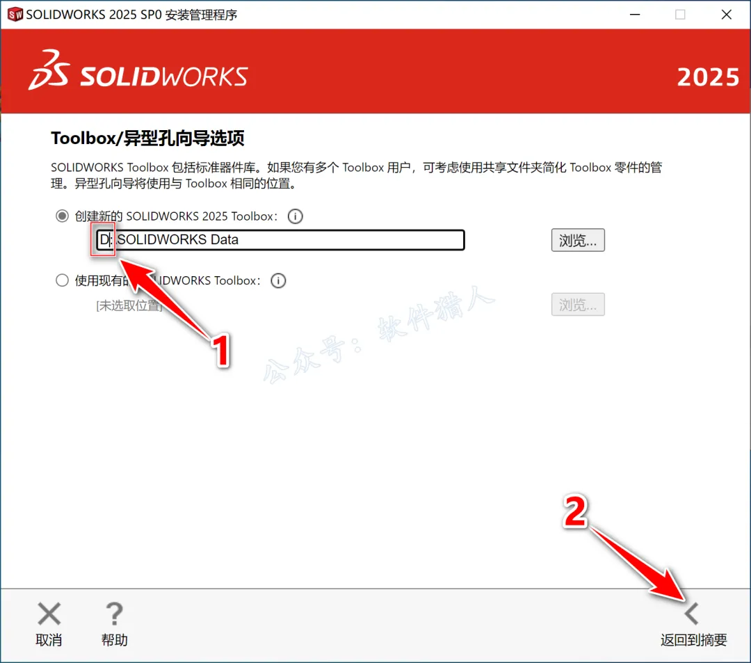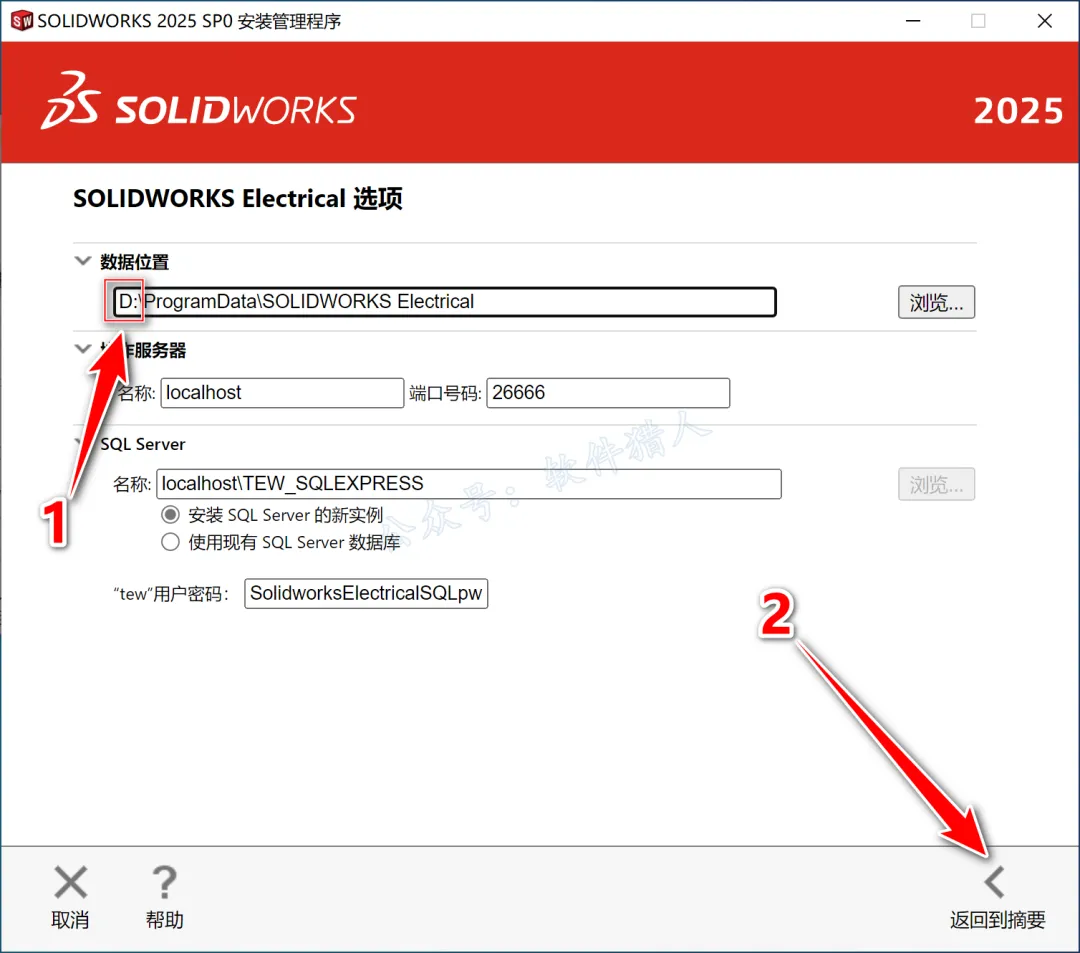 23.修改数据位置路径地址中的第一个字符C可更改安装位置(如:把C改为D软件将安装到D盘),点击【返回摘要】。