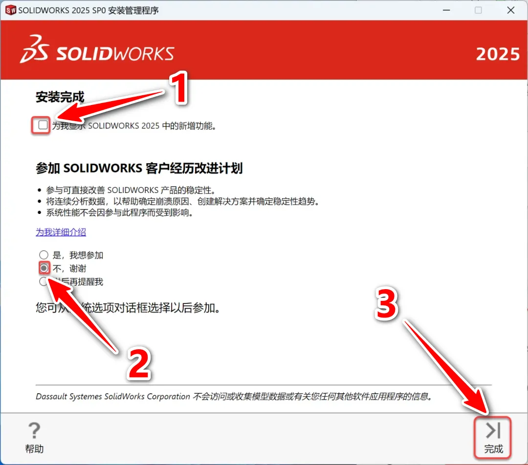 28.①取消勾选【为我显示...;②选择【不,谢谢】;③点击【完成】(若提示重启,点击”现在重新启动“,没有则忽略)。