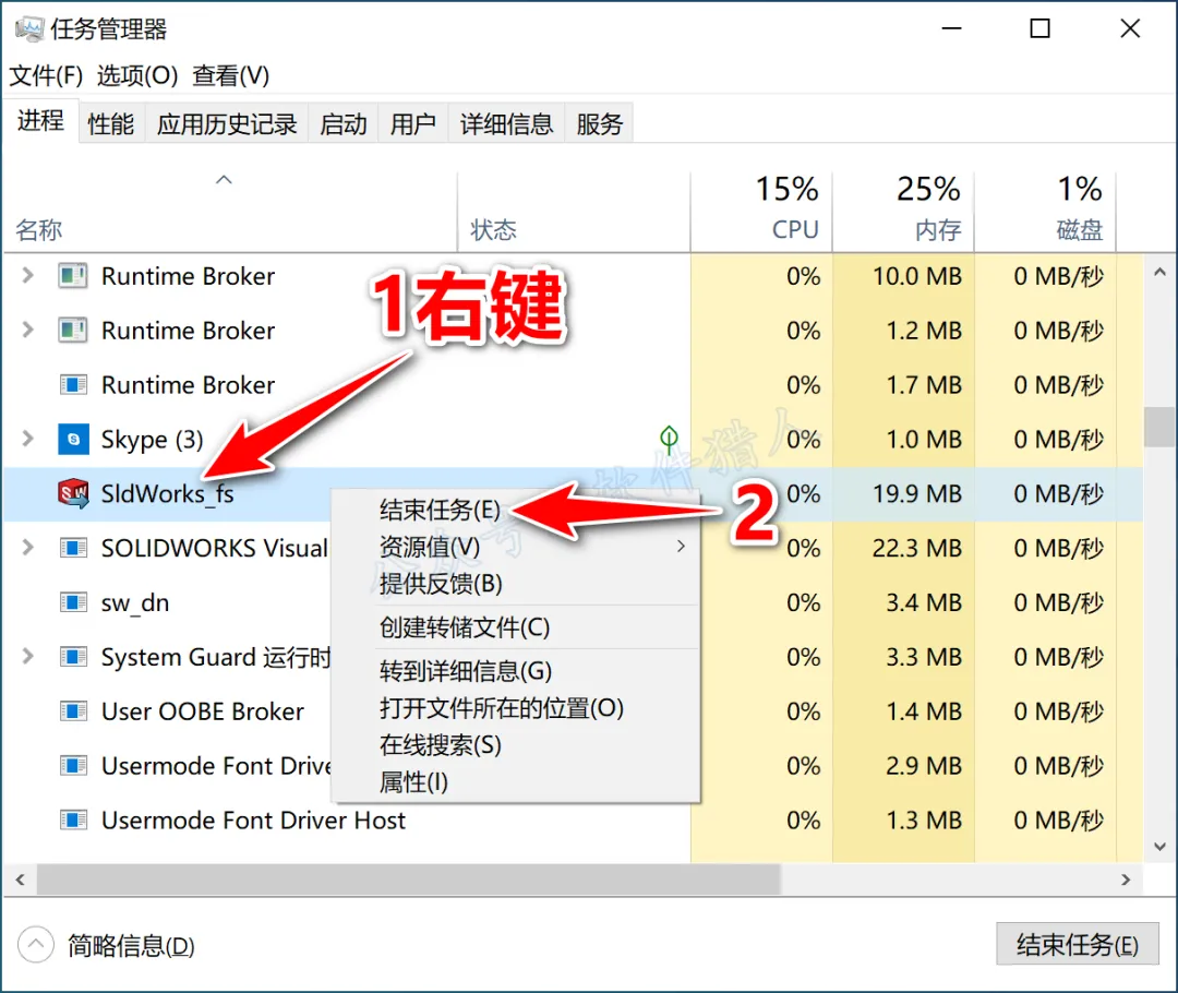 33.在键盘上同时按住“ESC+Shift+Ctrl”键打开任务管理器,在进程中找到并右击【sldworks_fs】选择【结束进程】。
