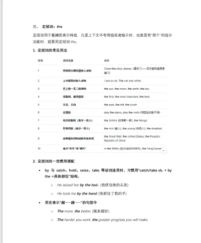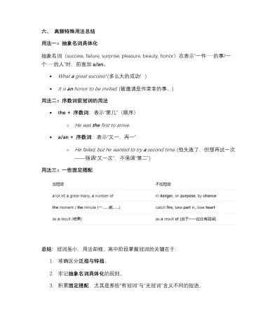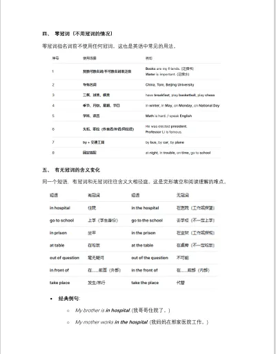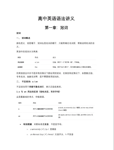 大家好,我是学长!冠词虽然在英语语法体系中体量不大,但无论在高考英语还是在日常表达中占据着独特而重要的位置。今天给大家分享一篇语法讲义(下载文档请点击文末的阅读原文跳转,提取码:YING),后续也会陆续不定期的整理和分享。理解冠词的意义和用法,不仅有助于应试,更能提升英语表达的精准度。1.抓住中英语思维的差异冠词顾名思义,就是名词的帽子,其实也属于限定词的一种。在英语语法规则中,名词前大多数时候都需要有个帽子,这样名词短语才能成立。比如 a new book是一个正确表达,但new book就是一个错误的名词短语。但在中文表达里,我们说一本新书或者只说新书在语法规则上都可以,只是语义上稍有差别。除此以外,英文还通过冠词来区分泛指和特指,比如:A book is a source of knowledge.(泛指任何一本书)The book is a source of knowledge.(特指这本书)这也是我们在考试和日常表达中都需要注意的地方2.冠词虽小,却影响句子结构的正确性:比如固定搭配导致的语义不同:in hospital vs in the hospital(意思截然不同)比如冠词往往暗示了名词可数性,语义也会有差异:a success vs success3.高考中对冠词考查通常有以下几点:(1)掌握 a/an/the 的基本用法;(2)在语境中判断泛指/特指,或者固定搭配的语义差异;(3)在写作中正确、灵活运用综上,冠词是英语语法体系中规则最清晰、掌握最容易的板块之一。掌握了冠词的意义与用法,不仅对高考有帮助,更能提升英语表达的精准度。下面是关于冠词的主要意义和用法,供大家参考。