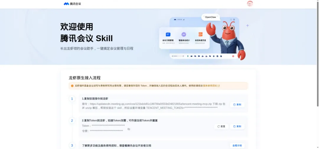 先去腾讯会议的龙虾专用入口登录,拿到属于你自己的 Token,再把这个 Token 配到 OpenClaw 里。
