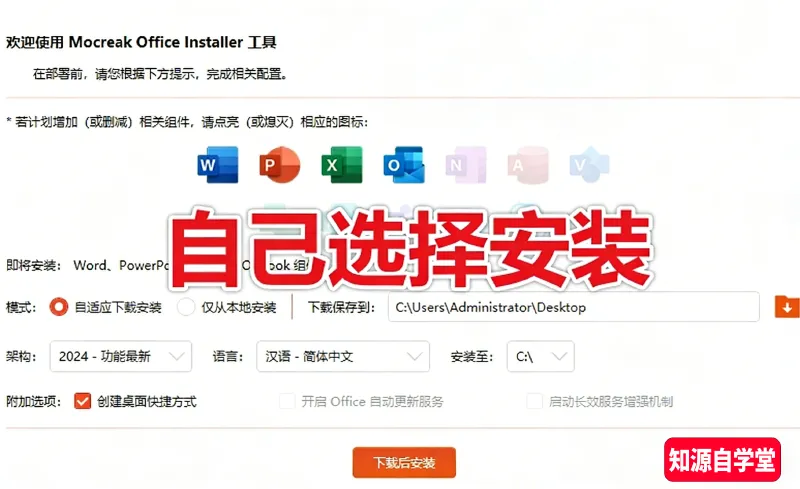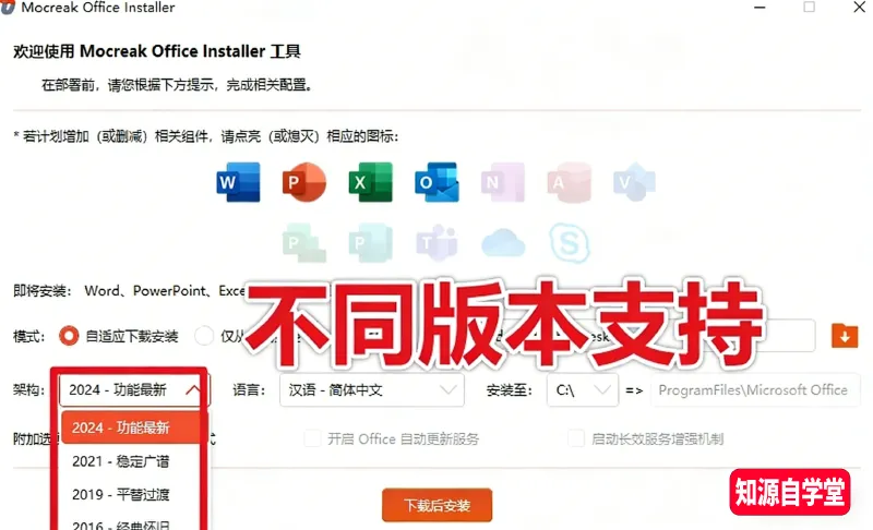 支持自定义选择Office2016—2024各版本,按需勾选安装组件,只想装Word也能单独实现