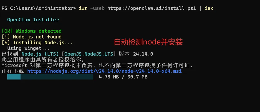 脚本会自动检测系统环境,如果检测到未安装 Node.js,会自动调用 winget 下载安装。