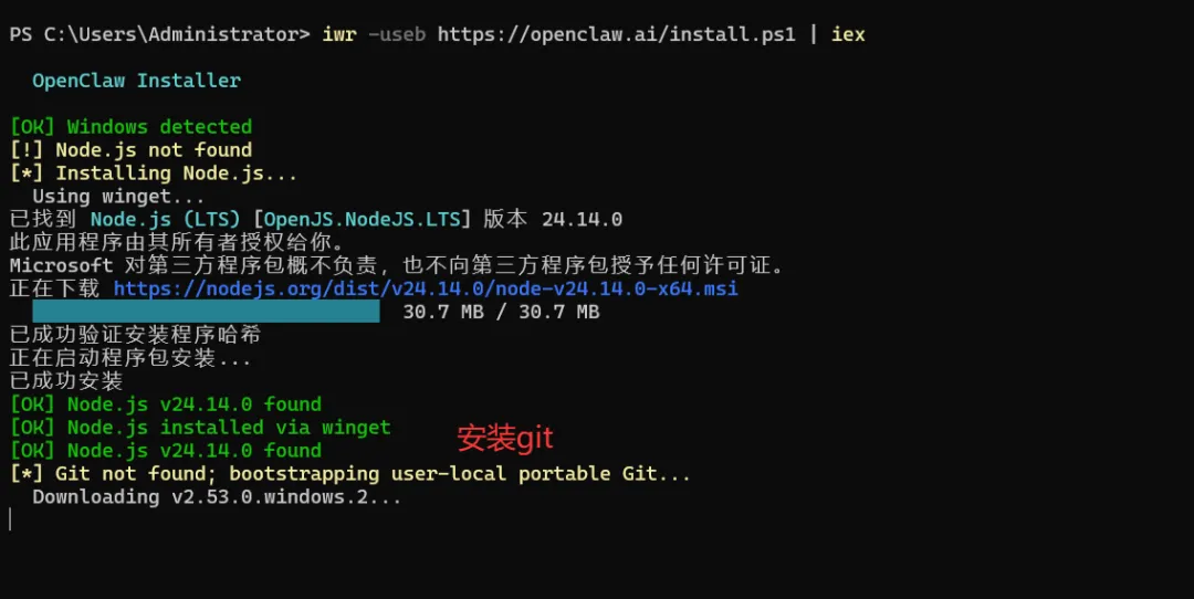 脚本检测到未安装 Git 后,会自动下载并配置便携版 Git。