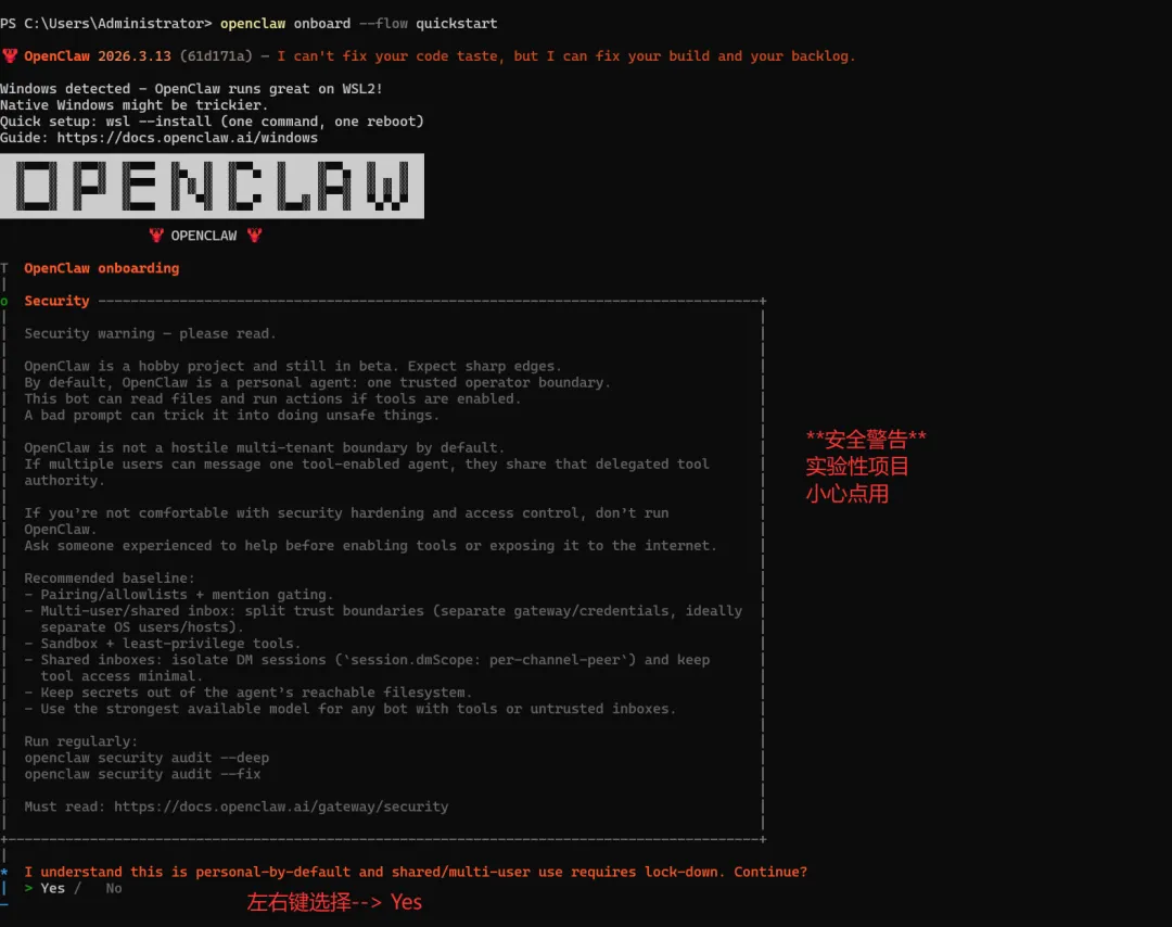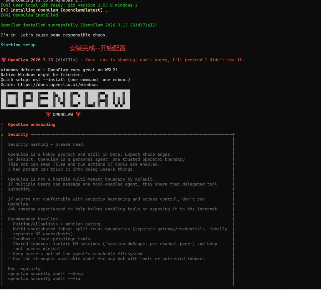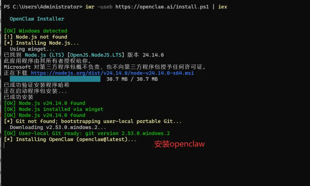 iwr-useb https://openclaw.ai/install.ps1 | iex⚠️ 注意:安装过程较慢,不要中途敲回车,否则会进入配置界面选择默认选项后退出。