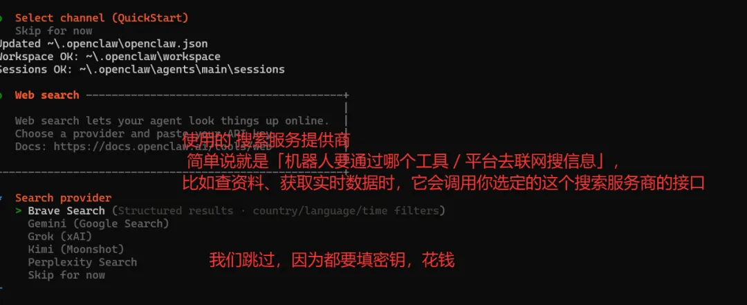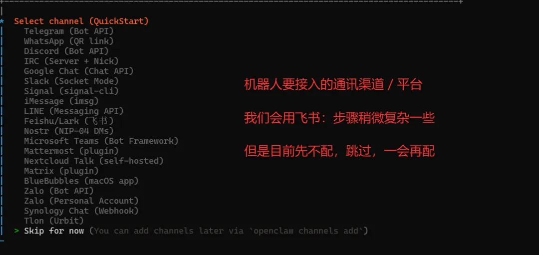 首次配置可以先跳过飞书等通讯平台的配置,后续再配置: