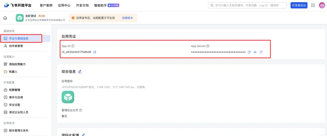 在 "凭证与基础信息" 中获取 App ID 和 App Secret: