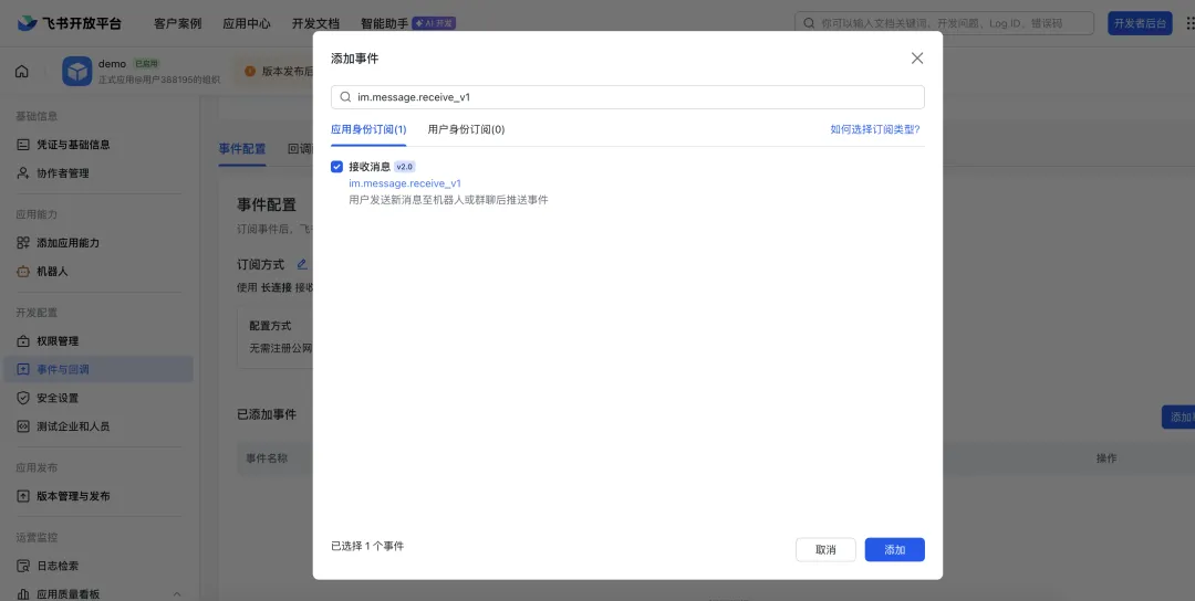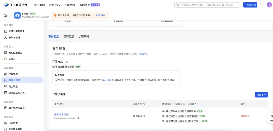 订阅方式选择 "长连接"(WebSocket 模式,不需要公网 IP):