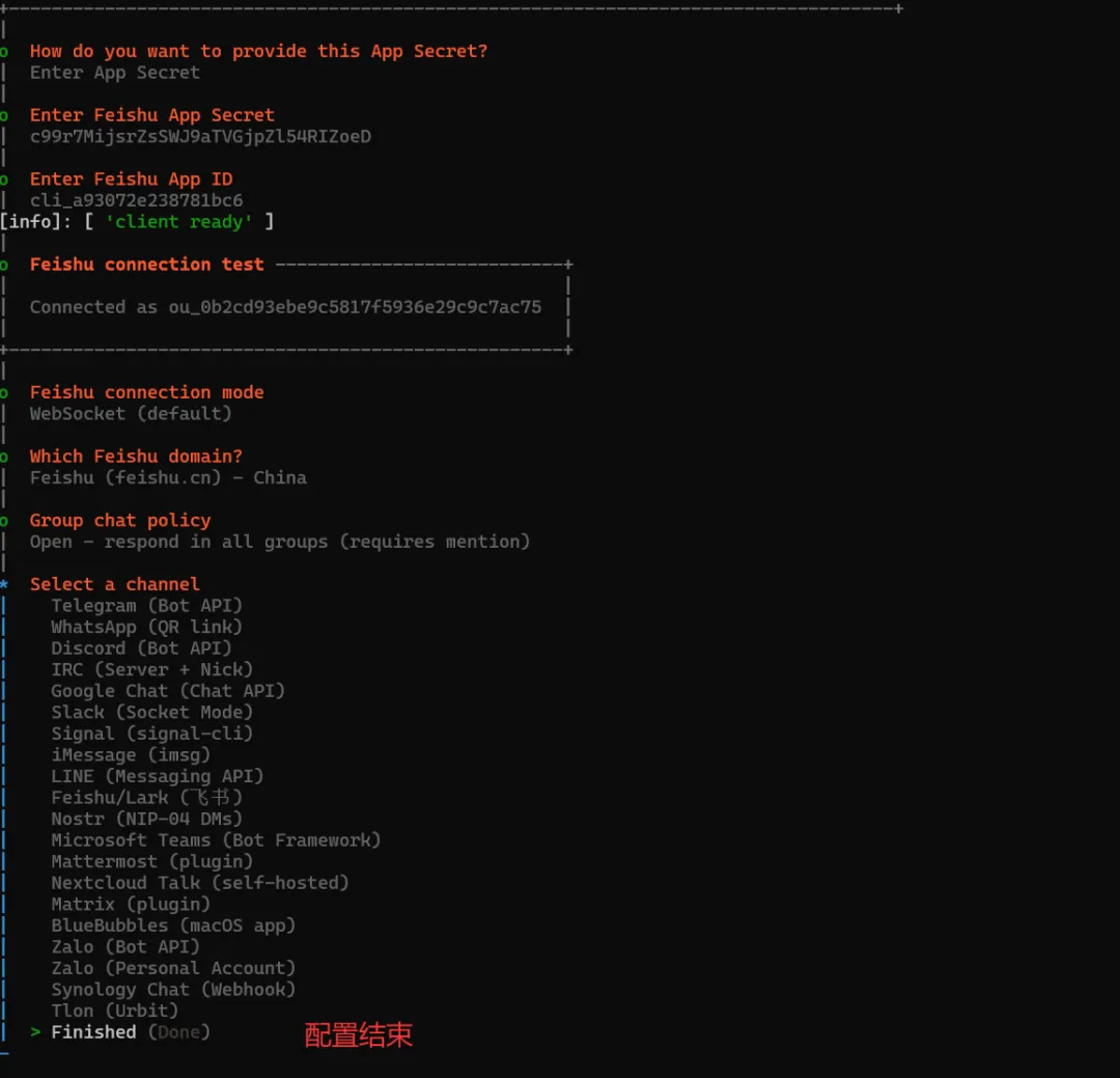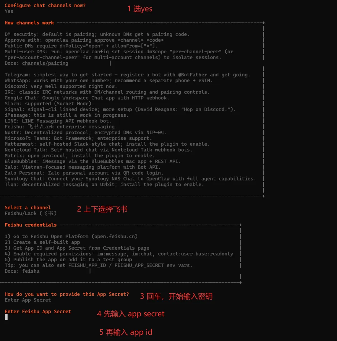 openclaw channels add选择飞书并输入 App ID 和 App Secret: