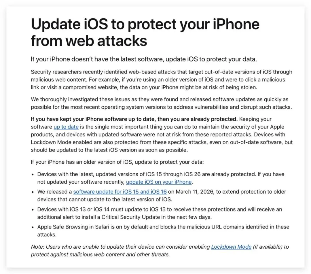 如果你的iPhone 仍停留在旧版本,系统近期也会跳出「安全性更新」提醒,通知你进行更新;苹果表示,只要有持续更新系统,其实就具备防护能力,不在这次攻击影响范围内。另外iPhone 内建的Safari 也预设启用「Safe Browsing」机制,可自动阻挡已知的恶意网站,作为额外的一层防护。