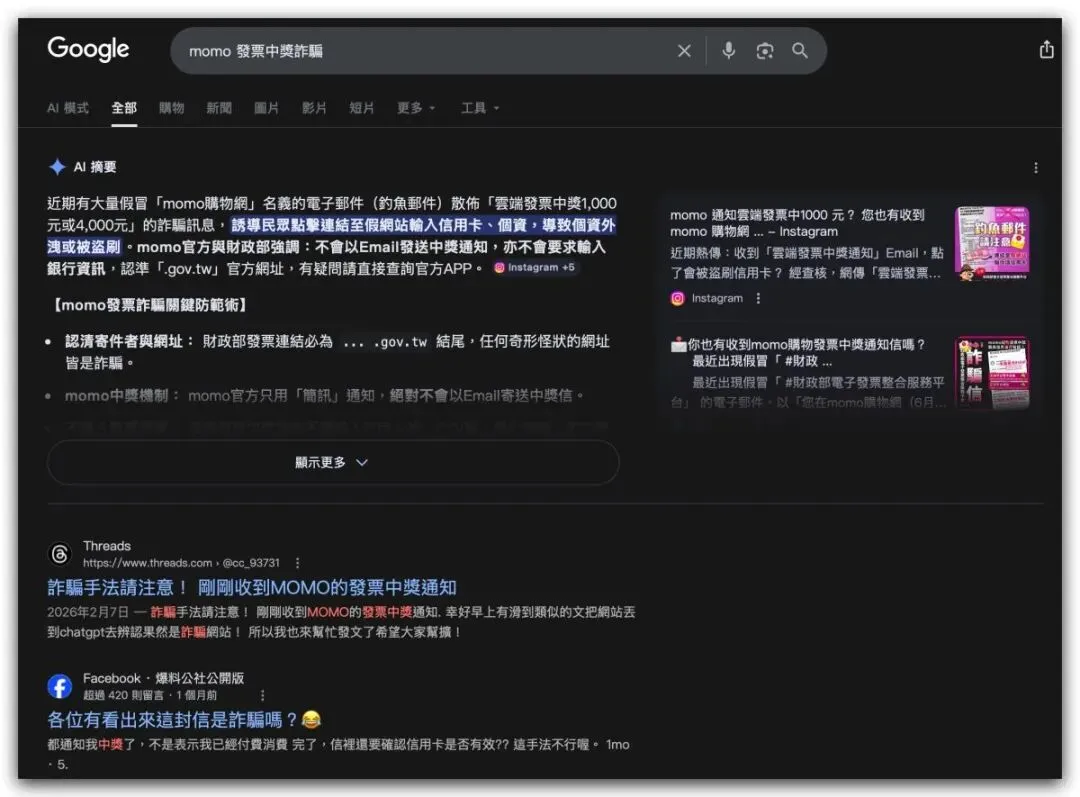 这边也推荐大家一个我很常用来分辨诈骗的方式;假设收到一个来路不明且里面包含网页连结的讯息,但你对这件事根本没印象,或觉得莫名其妙,那其实就可以到Google 以「讯息主旨+ 诈骗」作为关键字来搜寻确认,通常都会看到很多网友分享的经验或相关反诈骗公告。