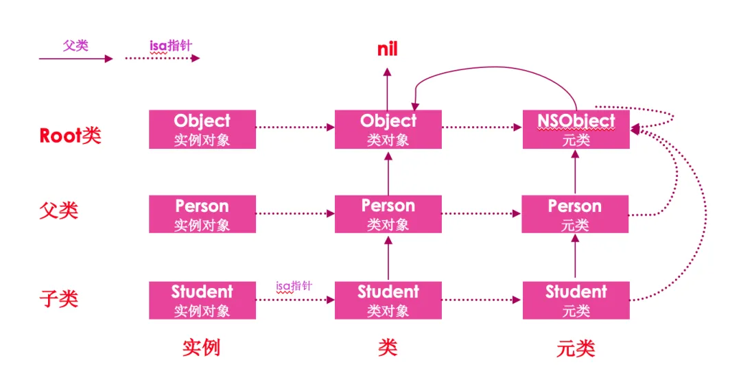 例如: 子类Student的实例对象的isa指向的对应的Student类对象,而Student类的isa指针指向的Student的元类,所有的元类最后都指向类NSObject元类, NSObject元类的也指向了它自己,它也被称为根元类。
