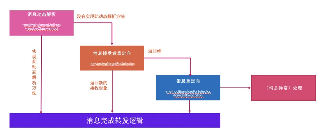 当调用方法IMP找不到时, Runtime提供了消息的动态解析,消息接受者重定向, 消息重定向(方法签名)这三步处理消息。 调用的流程图如下: