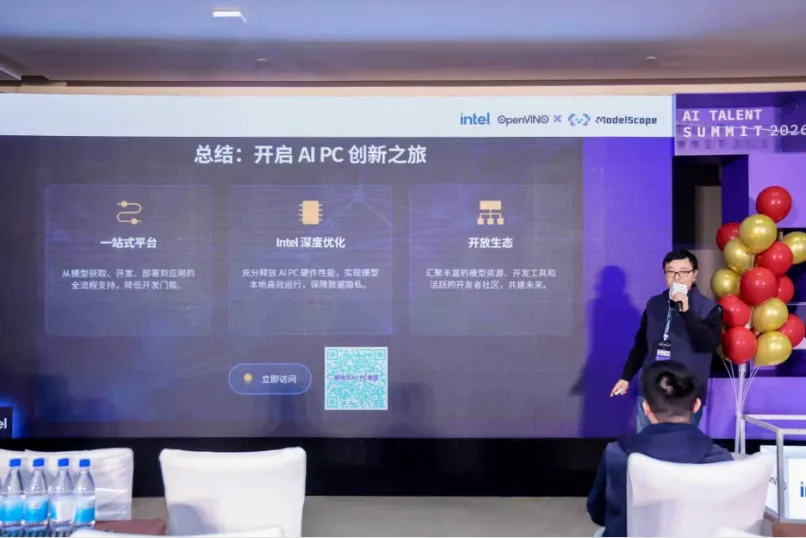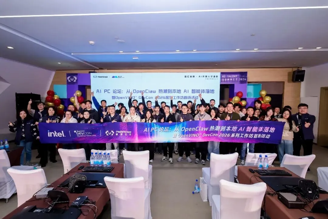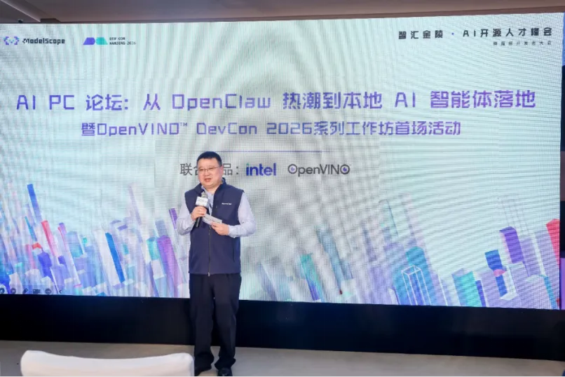 2026 年 3 月 22 日,OpenVINO™ DevCon 2026 系列工作坊的首场活动在南京成功举办。作为智汇金陵· AI开源人才峰会的一部分,本次活动由英特尔联合魔搭社区共同呈现,吸引了众多开发者、技术专家与合作伙伴齐聚一堂,共同探讨 AI PC 时代的技术趋势与端侧智能体的落地实践。