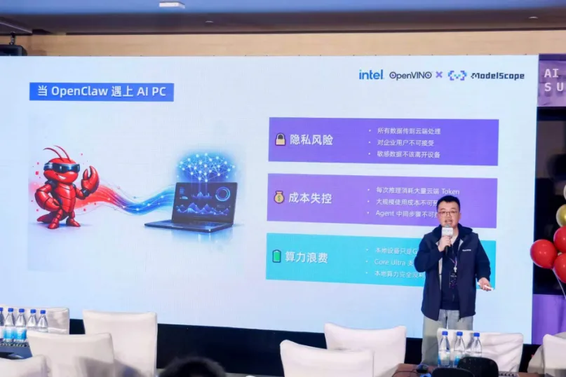 当前最受开发者关注的 OpenClaw 成为下半场的焦点。英特尔 AI 软件方案工程师方骁然老师以《当 OpenClaw 遇上 AI PC:英特尔 AI SuperBuilder 混合 AI 实践》为题,深入讲解了如何在保障本地隐私的同时,实现端侧与云端的智能体灵活调度,赢得了现场热烈反响。