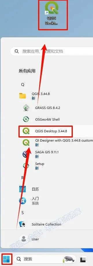 9.点击“开始“菜单栏,点击“所有应用“,找到“QGIS“软件,鼠标左键拖拽到桌面上即可创建桌面快捷方式