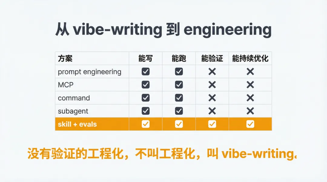 严格来说,工程化的构建不依赖名词,而是一个系统的、追求质量的学科。只有 skill 提供了 anthropic 官方的 evals 验证支持,可以工程化地调优,而不只是 vibe-writing。