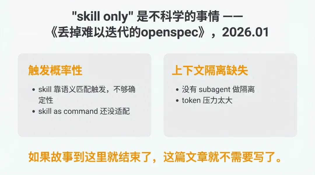 触发概率性——skill 靠模型语义匹配触发,不够确定性,skill as command 还没适配 上下文隔离缺失——没有 subagent 做上下文隔离,token 压力太大