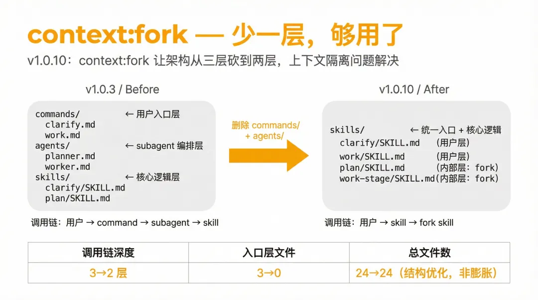 context:fork 改变了这个局面。它提供了同等的上下文隔离能力,但少了一层调用链。v1.0.5 的重构(+905/-1005 行,17 个文件)一次性把架构从三层砍到两层: