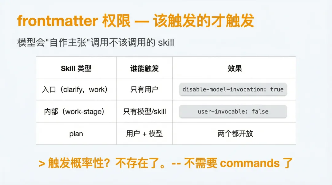 第二个问题是触发的确定性。模型会"自作主张"调用不该调用的 skill——比如在对话中自动触发 clarify(v1.0.7 发现的问题)。
