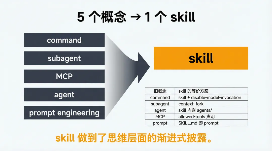 不是说这些概念不重要——它们仍然是 skill 底层的实现机制。但作为架构师的日常思维单元,只需要 skill 一个概念就够了。需要深入的时候再渐进式披露。