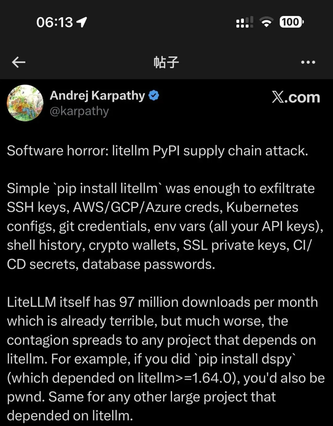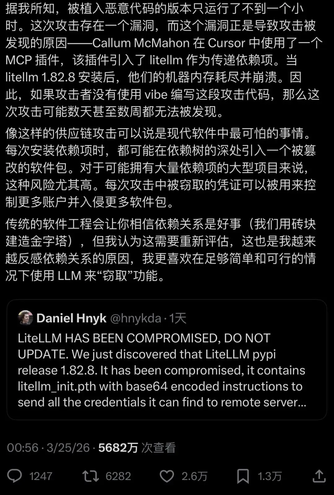 就在昨天,A神在X上爆料了litellm这个每月有一亿下载量的供应链攻击风险,5kw人关注。