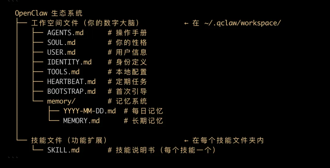 位置: ~/.qclaw/workspace/AGENTS.md数量: 1个(整个系统)作用: 定义你在这个工作空间的行为规则(其实就是要做什么,不要做什么)。