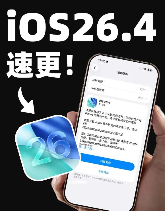3月25日,苹果正式向所有兼容设备推送iOS 26.4,版本号23E246。距离上一个正式版只过了20天。