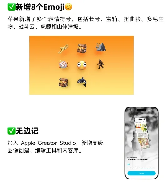 表情符号这次新增8个,包括长号、宝箱、虎鲸、芭蕾舞者(含六种肤色版本)、大脚怪等,Unicode 17标准里的符号苹果这次终于开始收录了。