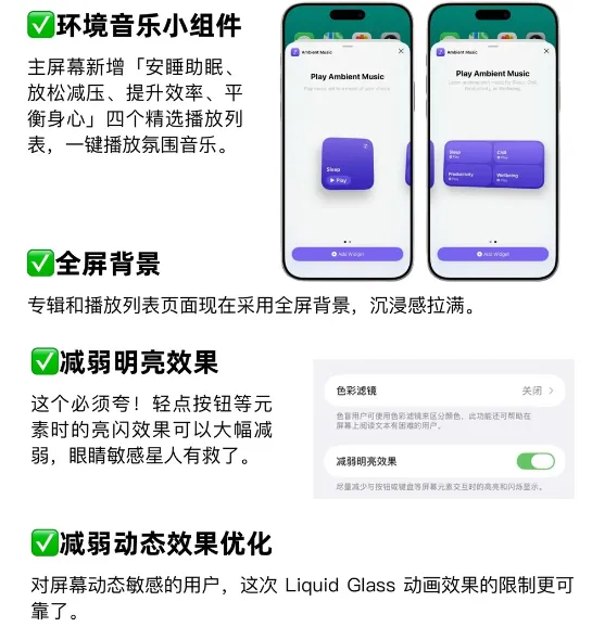 辅助功能里加了个叫减弱明亮效果的开关,路径就是设置辅助功能显示与文字大小,开启之后,点击按钮或者键盘的时候,屏幕的高亮和闪烁就会明显减弱,对于视觉敏感的用户来说,这个开关可是等了挺久。