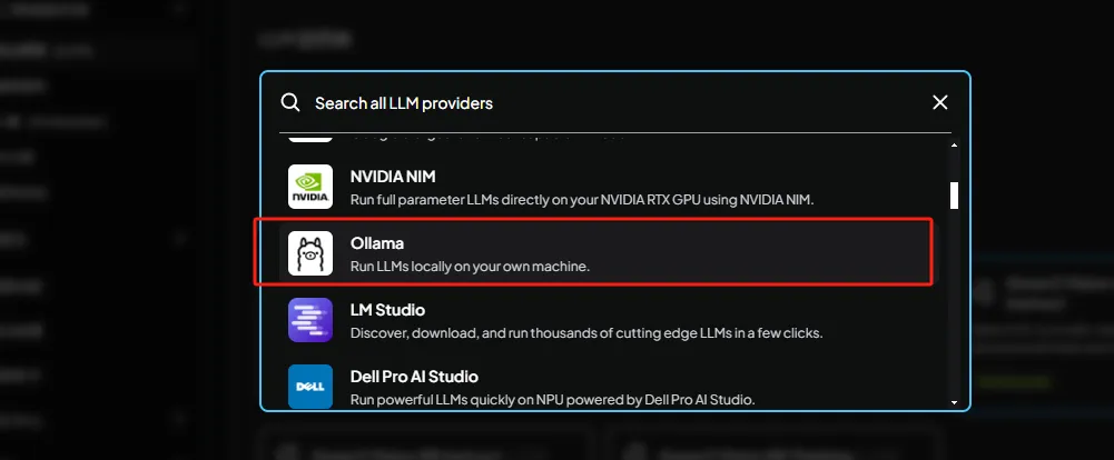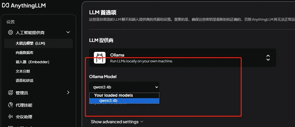 可以看到左侧有对应的LLM提供商,我们在右侧这里点击下拉