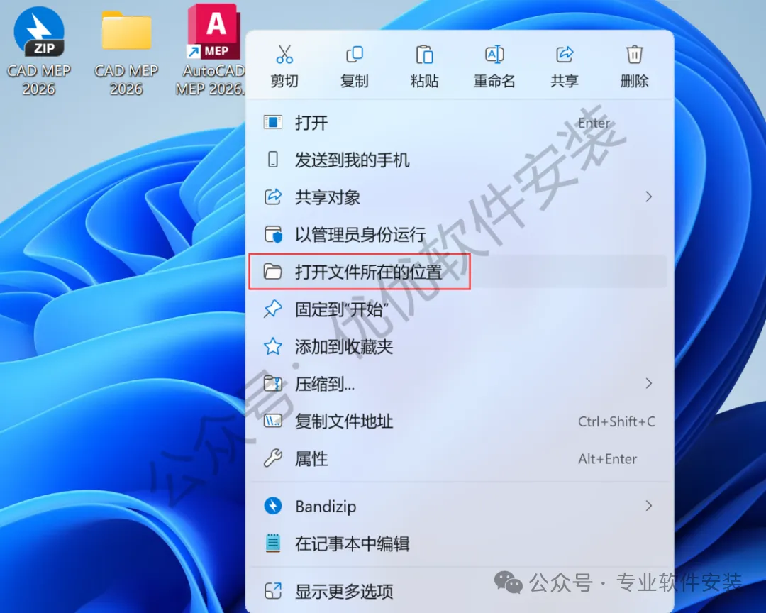 11、回到桌面,右键桌面上的【CAD MEP 2026软件图标】,点击【打开文件所在的位置】