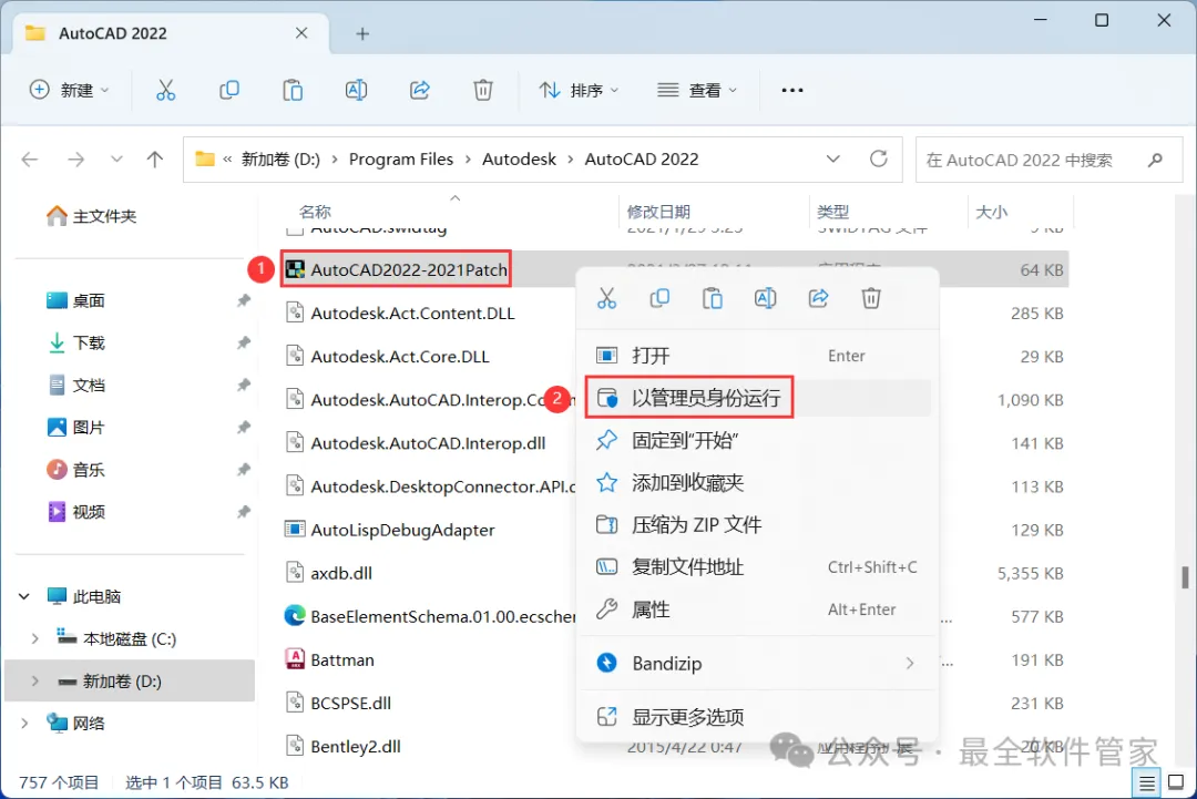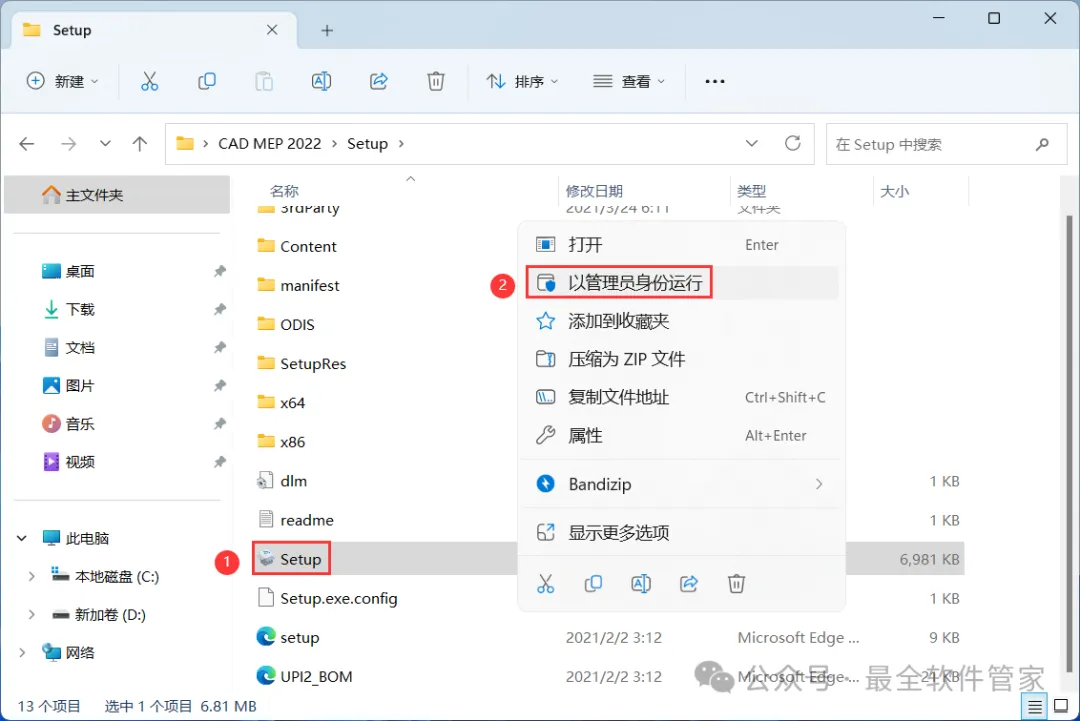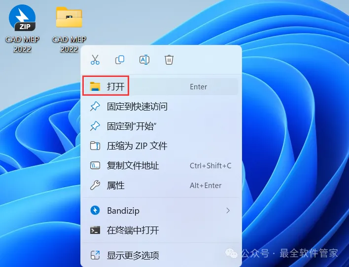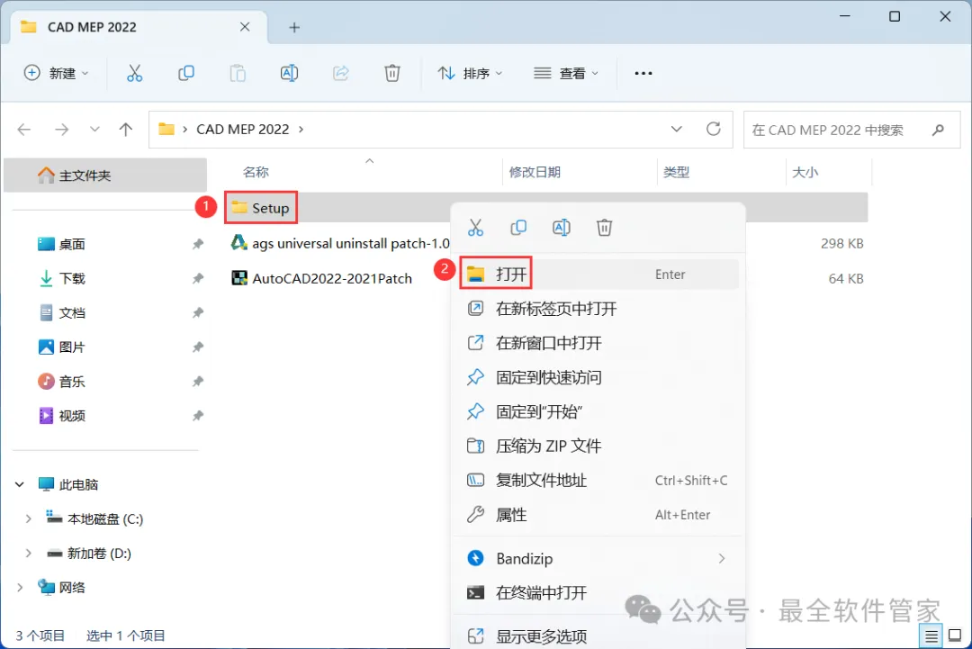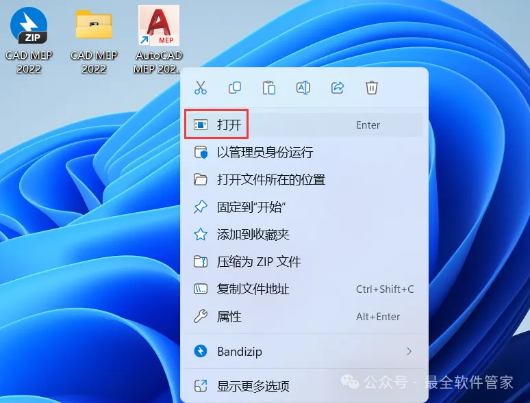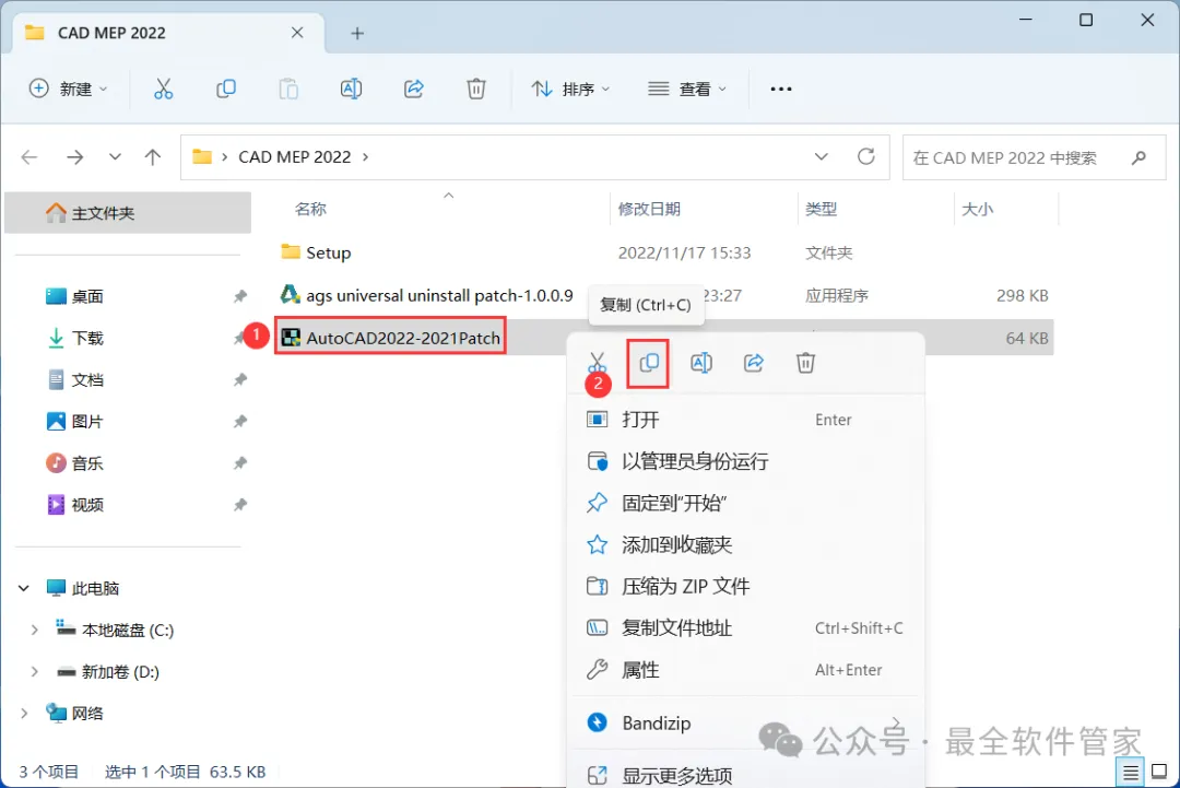 [不限速下载]:免费获取百度网盘不限速下载工具。公众号内回复:不限速[注意事项]:安装前请关闭网络、杀毒软件和防火墙,否则易安装失败。公众号内回复:1[解压软件]:小编用的解压软件是Bandizip,获取Bandizip软件安装包。公众号内回复:21、下载CAD MEP 2022软件安装包到电脑上,右键选择【解压到CAD MEP 2022\】4、找到【Setup】应用程序,右键选择【以管理员身份运行】它 5、语言选择【简体中文】,勾选【I agree】,再点击【Next】6、软件默认安装在C盘,可自定义更改软件安装位置,这里小编选择安装在D盘;点击【安装】 10、回到CAD MEP 2022文件夹,找到【AutoCAD2022-2021Patch】文件,再右键点击【复制按钮】 11、回到桌面,右键桌面上的【CAD MEP 2022软件图标】,点击【打开文件所在的位置】13、找到粘贴的【AutoCAD2022-2021Patch】文件,再右键选择【以管理员身份运行】它16、回到桌面,右键桌面上的【CAD MEP 2022软件图标】,点击【打开】 19、以上就是CAD MEP 2022软件安装的全过程,要是对你有帮助的话,请为小编点个赞!免责声明:软件资源均来源于网络,仅供用户交流学习与研究使用,版权归属原版权方所有,版权争议与本公众号无关,用户本人下载后不能用作商业或非法用途,否则后果均由用户承担责任;如果您访问和下载此文件,表示您同意只将此软件用于参考、学习而非其他用途,否则一切后果请您自行承担,请于下载后24小时内删除,不允许用于商业用途,否则法律问题自行承担。如果您喜欢该软件,请支持正版软件,购买注册,得到更好的正版服务。