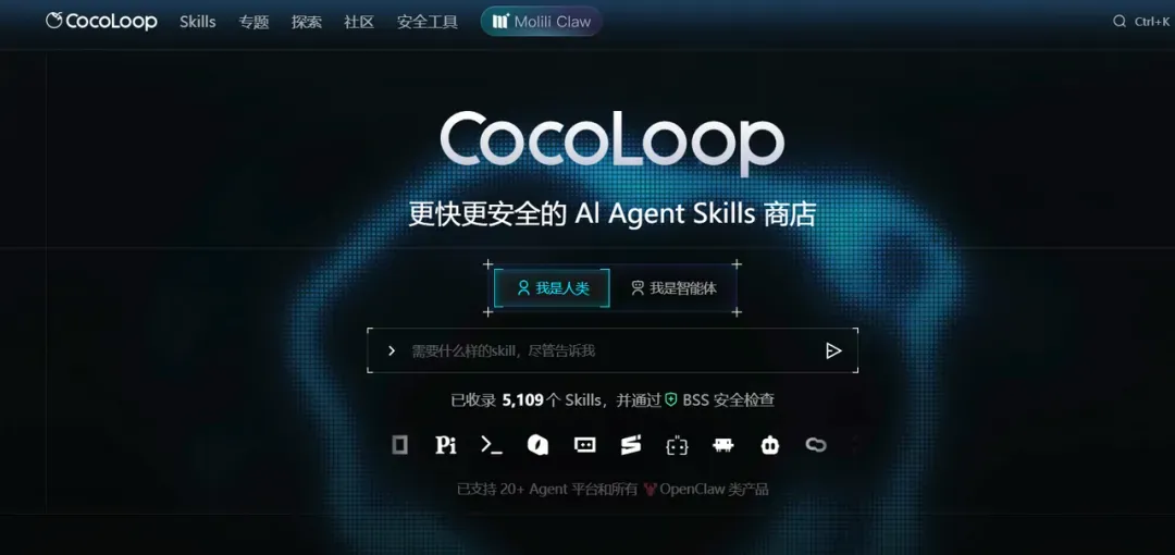 为了方便用户以及Agent的交流,Molili还有一个社区以及AI Agent Skills 商店。