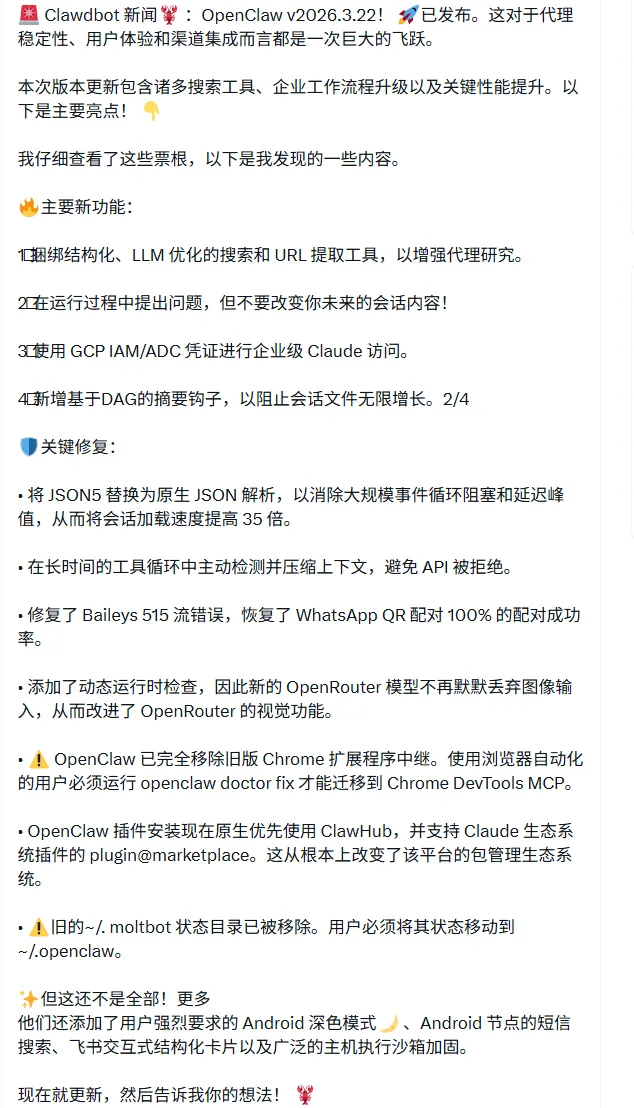 我打开3月22日OpenClaw的更新日志,第一反应是:这帮人疯了吗?