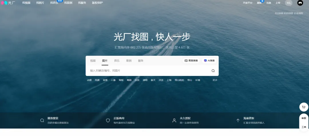 网站背景与资源规模: 光厂(VJ师网)主打正版创意素材,官网明确提供视频素材、图片、音乐、音效等多品类资源,覆盖4K商用级影视创作素材库,并强调每天更新千款高质量模板。对于“自然景观图片”这类需求来说,它的优势不只是有图,还能顺手搭配视频、模板和音乐,方便做统一风格的整套内容。光厂站内也设置了“找图片”“找音乐”等入口,说明它已经不是单一的视频站,而是偏综合型的国内正版素材平台。