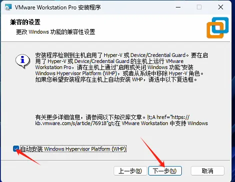 第6步、勾选自动安装Windows Hypervisor Platform (WHP)后点击下一步