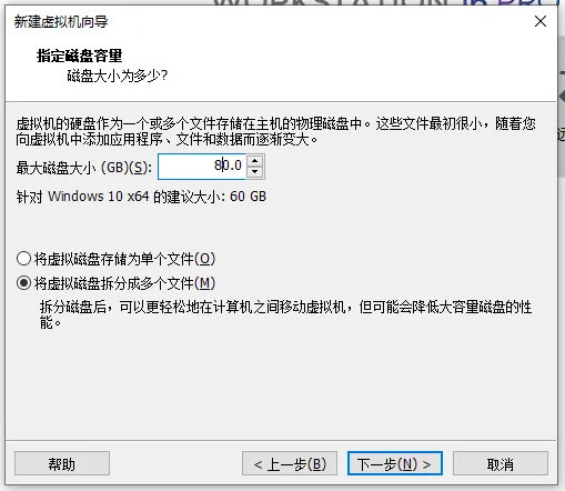 第9步、输入最大磁盘大小,默认的是60GM,我这里改成80GB,玩一般的游戏是够用了,这里具体大小还需要根据你的硬盘大小来输入。然后点击“下一步”