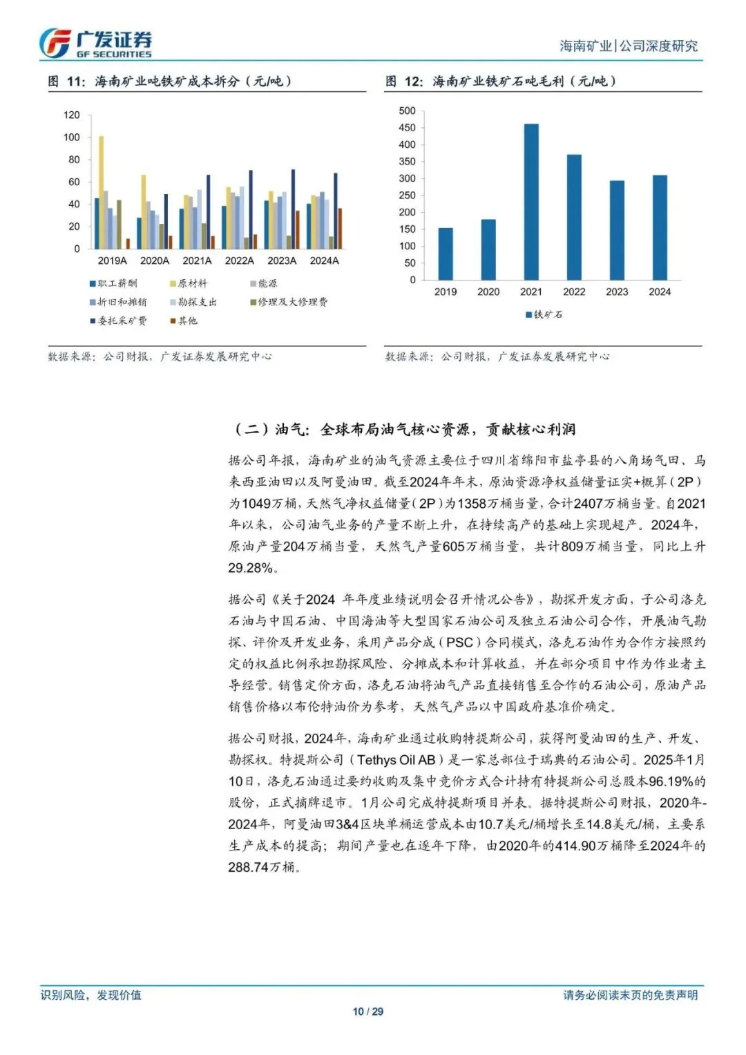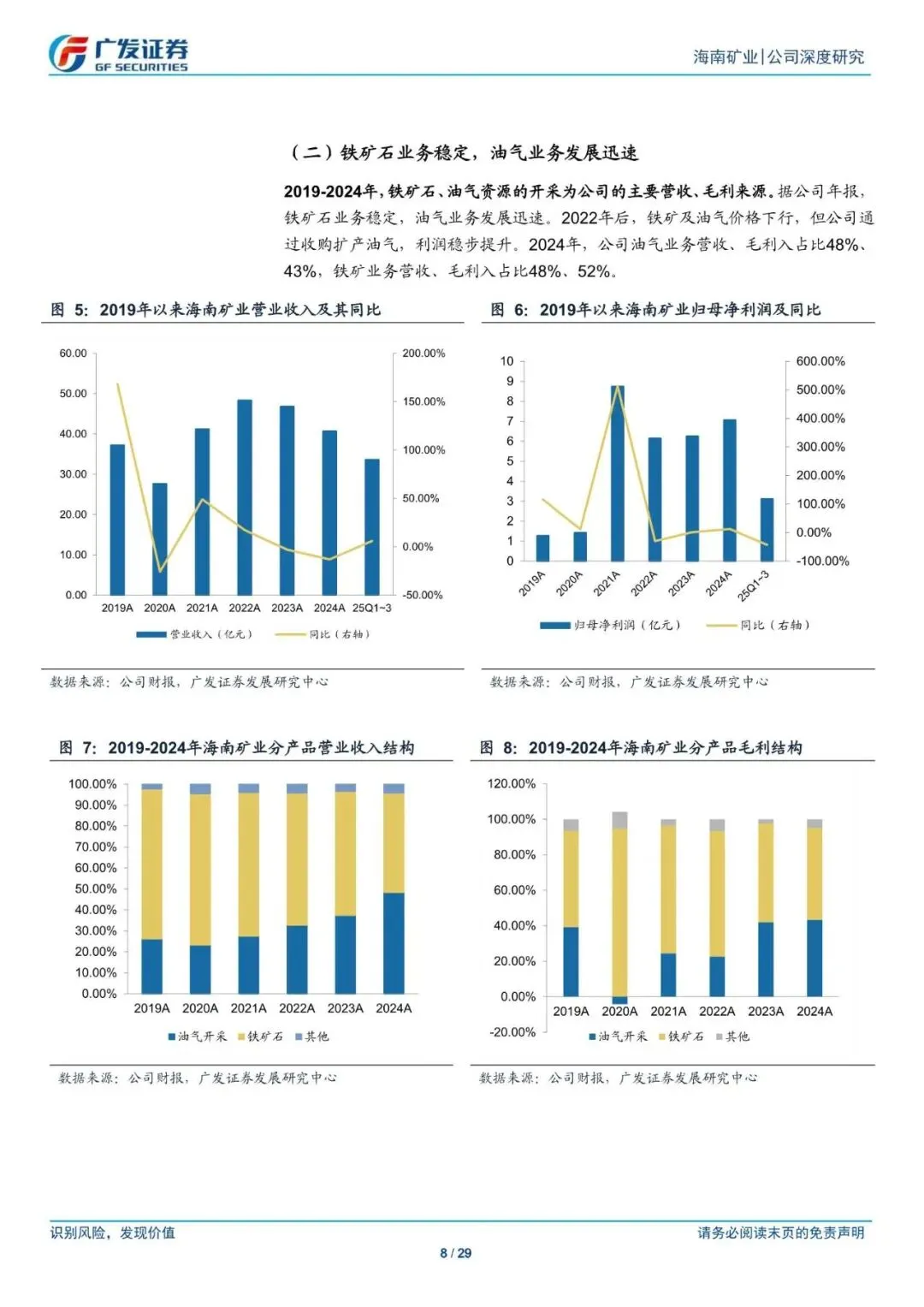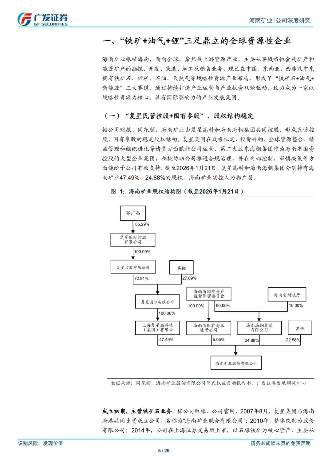 海南矿业是"铁矿+油气+锤"三足鼎立的全球资源性全业。"复星民营控股+国有参股",股权结构稿定。2019-2024年,铁矿石油气资源的开采为公司的主要营收、毛利来源,
