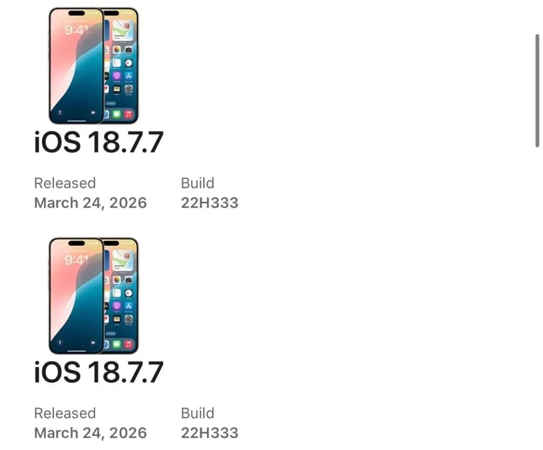 已经升级到iOS 18.7.7 RC版本的很多用户,他们的版本号和今日的正式版是相同的。像这样的用户不会接收到重复的推送,而且也不需要去进行额外的操作。