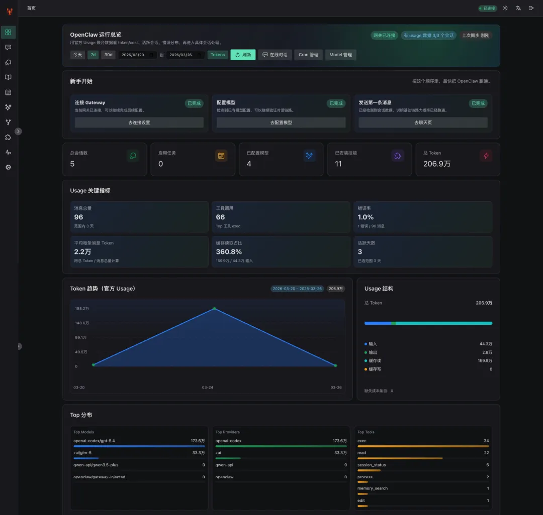 • 会话数、Cron 任务、模型数量一目了然 • Token 用量和成本统计可视化 • 趋势图,支持 Token/Cost 切换