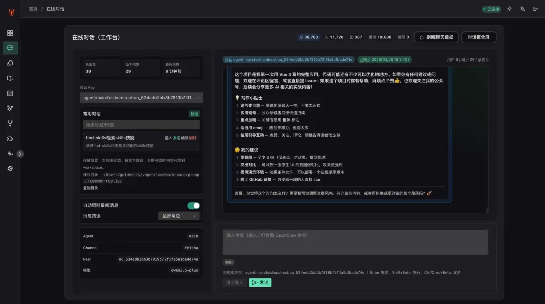 • ✅ WebSocket 实时通信 — 消息一个字一个字蹦出来,打字机效果丝滑可见 • ✅ 会话快速切换 — 下拉选择,不用反复登录 • ✅ 快捷回复模板 — 常用消息一键发送 • ✅ 命令补全 — /new/skill/model智能提示
