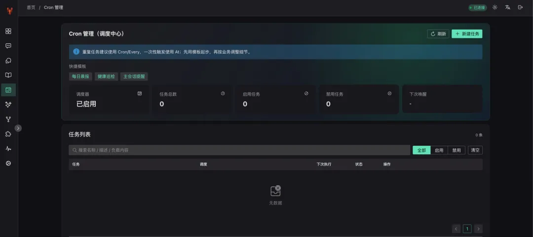 • 定时任务列表展示 • 启用/禁用快速切换 • 运行历史查看 • 立即执行测试