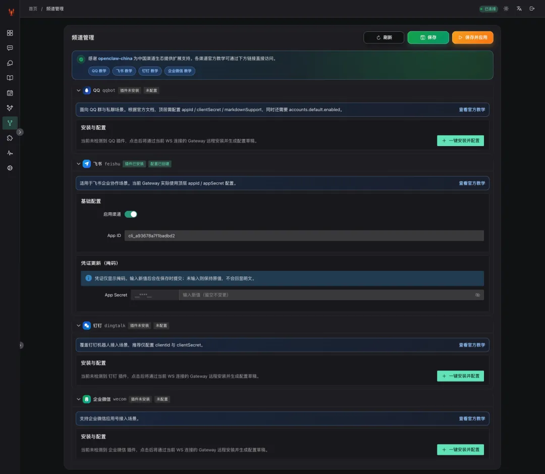 插件安装状态检测、账号配置、认证配对,全部可视化操作。