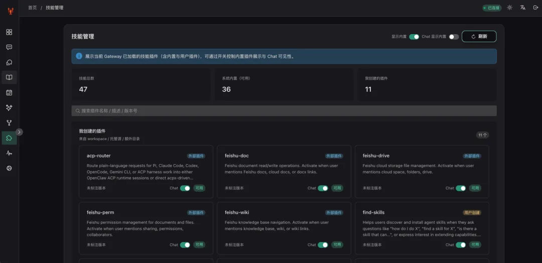 • 已安装技能列表 • 一键更新 • 启用/禁用切换 • 技能配置编辑