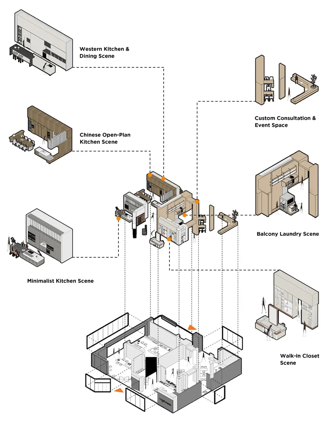 灵感和创新,是对未来生活方式的展望。在本项目中,我们的目标不仅限于产品和生活场景的展示,结合品牌的创新模块,我们在空间中规划了定制服务区,用户不仅仅可以采购产品,也可以在店内定制与之匹配的全套柜体。