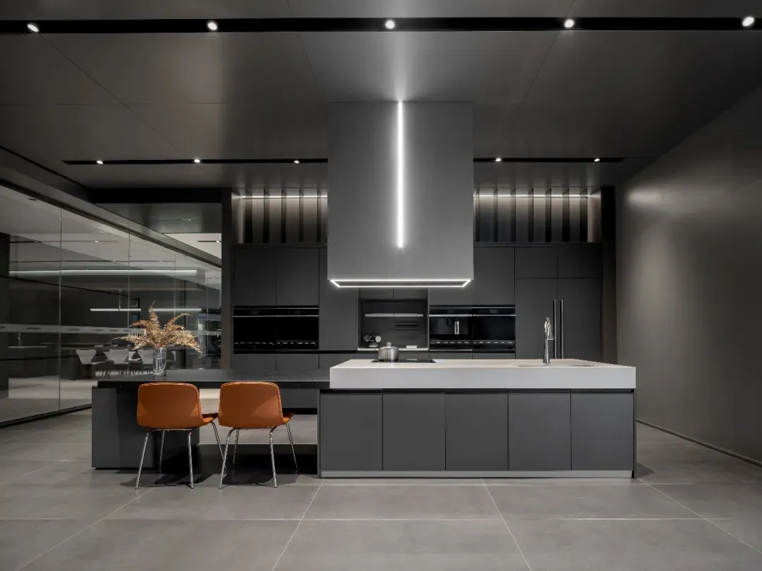 In the showroom's kitchen appliance area, a minimalist palette of calm blacks, whites, and grays defines the space, while metal and glass accents highlight its refined textures.
