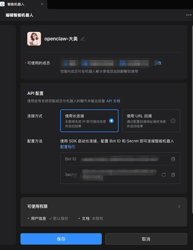 登录电脑端企业微信,进入「工作台」→「智能机器人」,点击「创建机器人」。 在配置页面选择「使用长连接」,然后点击「生成 Secret」。 系统会给你一个机器人 ID 和 Secret,复制保存,页面先别关(权限也可以打开哦,后面方便自动管理企微文档)。